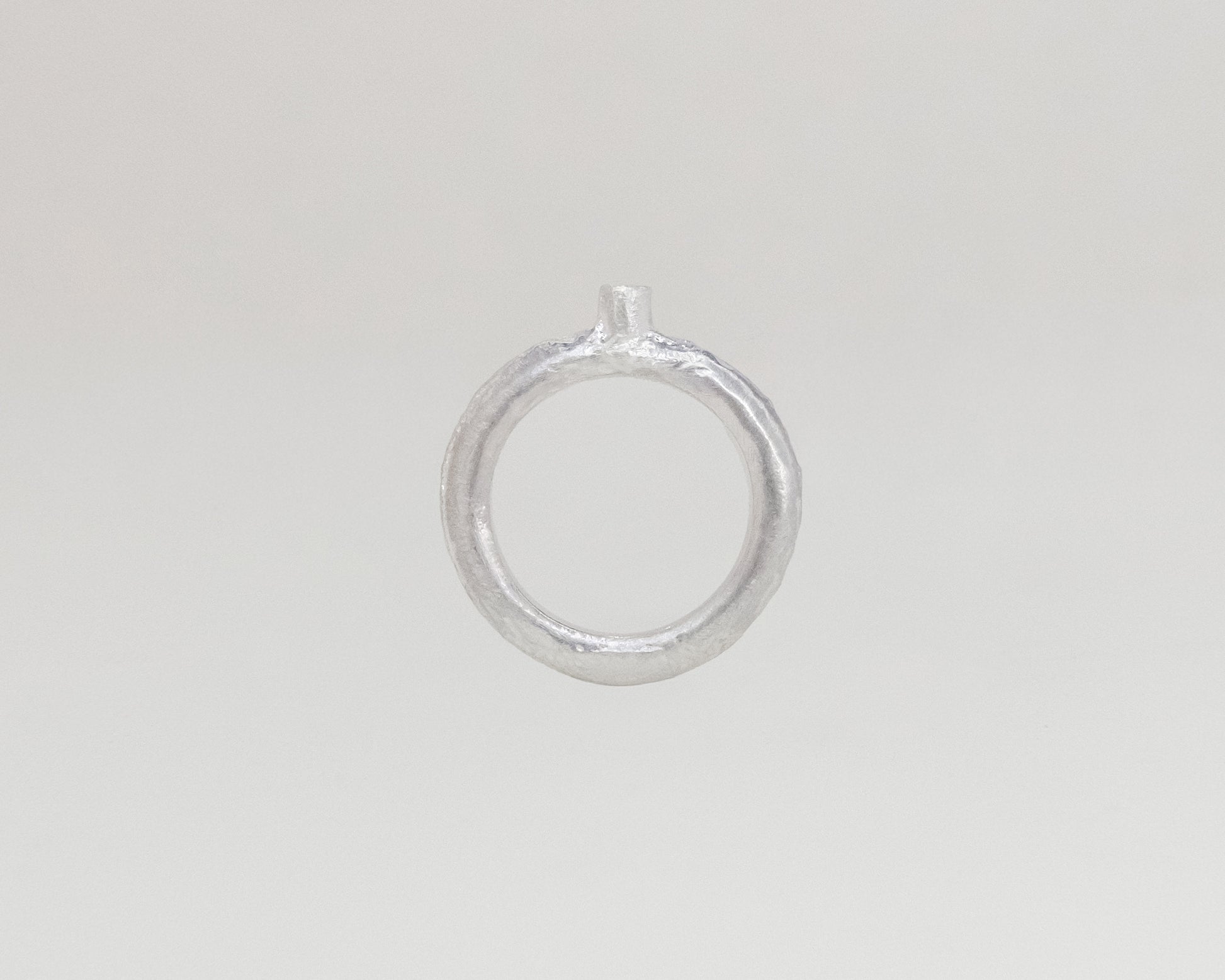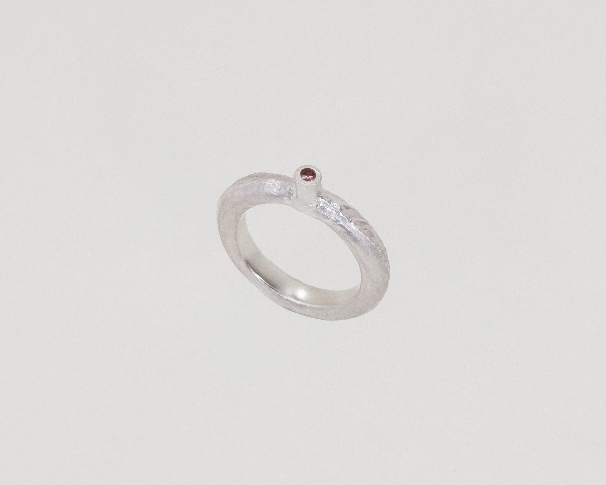 The Matte Mono Ring is crafted from recycled sterling silver and features a pink sapphire.